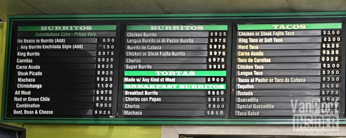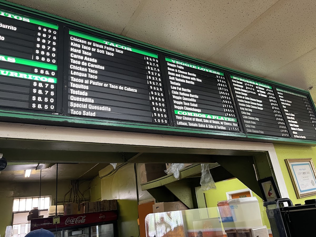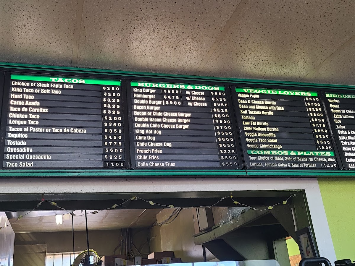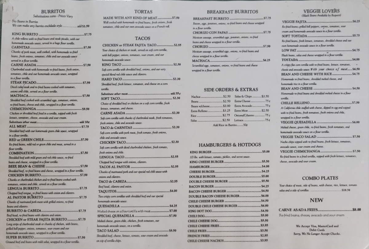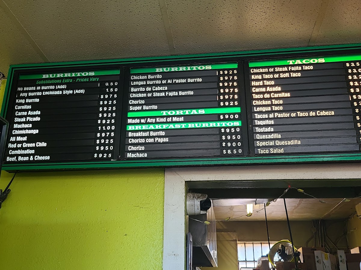 The menu is a treasure trove of mouthwatering options, with burritos and tacos taking center stage. Among the standout items, the King Burrito, packed with a chile relleno, refried beans, and juicy steak picado, is drenched in a smooth, homemade avocado sauce and encased in a sizeable flour tortilla for just $3.95. If you’re in the mood for something hearty, the Carnitas—exquisite chunks of slow-cooked pork complemented by fresh onions and tomatoes—won't disappoint, priced at only $3.75. For those keen on a lighter bite, the Veggie Fajita option includes grilled bell peppers and onions with a delightful creamy avocado sauce, making it a perfect choice for veggie lovers.